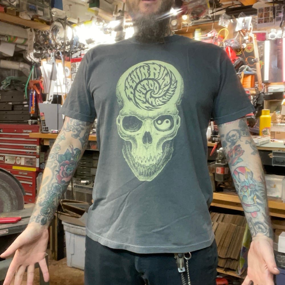 Natural discharge printed on 100% cotton Comform Colors brand shirts. Gray or Washed-out Green.